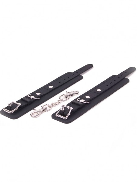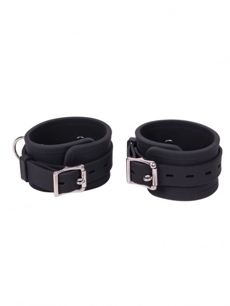 Paire de menottes pour cheville en Siliconeu00a0tru00e8s confortable et de grande qualitu00e9. Pour renforcer la rigiditu00e9 nous avons ajoutu00e9 une laniu00e8re de caoutchouc u00e9pais sur toute la longueur. Chaque menotte est ru00e9glable et est u00e9quipu00e9e d’un anneau D.