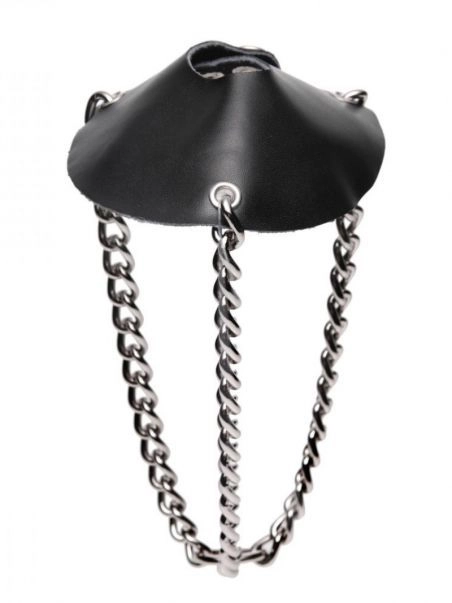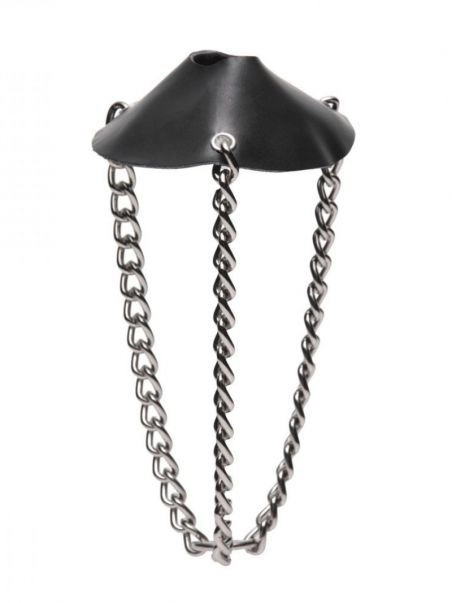 Pour les amateurs du travail des couilles, ce ballstretcher parachute permettra de les isoler solidement gru00e2ce u00e0 son cercle en cuir de haute qualitu00e9 et ses boutons pression. Dotu00e9 de plusieurs chau00eenes, vous pourrez y accrocher le poids de votre choix (non fourni).
