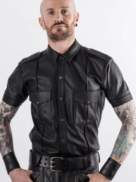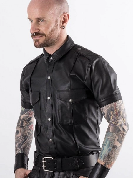Notre chemise parfaite ! Taillu00e9e dans un cuir souple pour plus de confort, la chemise Slim Fit Bruthal Gear se caractu00e9rise par une coupe tru00e8s ajustu00e9e. Le bouton pression u00e0 l’arriu00e8re du col assure un maintient parfait tandis que ses manches courtes sont resserru00e9es tout spu00e9cialement pour mettre les bras en valeur. Un incontournable de l’uniforme cuir.