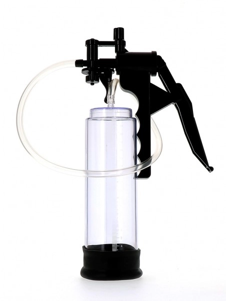 La pompe aspirante Pistol est u00e9quipu00e9e du2019une pompe u00e0 piston et du2019un cylindre transparent, pour que vous puissiez regarder votre pu00e9nis su2019agrandir pendant vos su00e9ances de Vacuum.