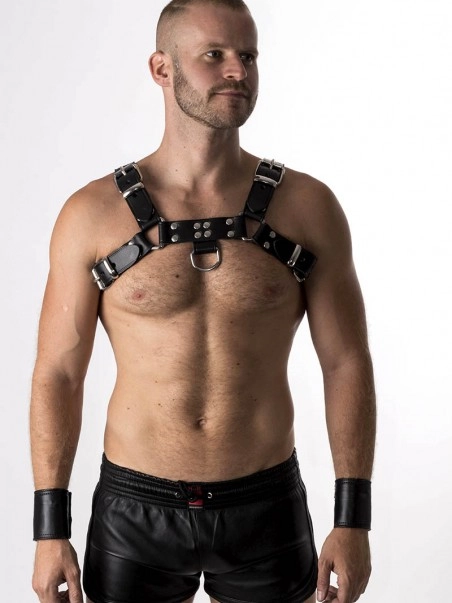 Le harnais se porte avec tous les types de vêtements et accessoires que vous trouverez dans notre boutique gay : pantalons ou shorts en cuir, ou sans rien.