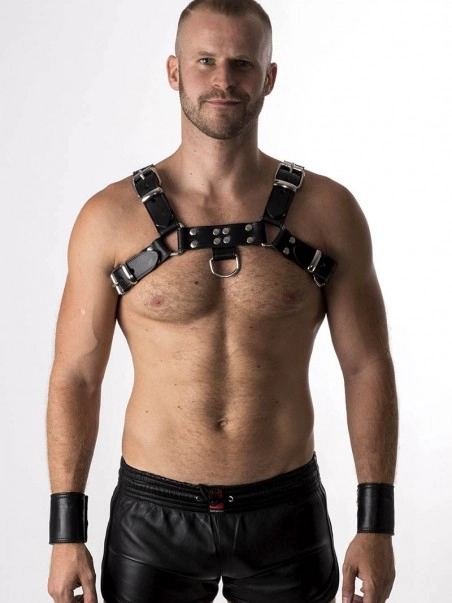 Le harnais en cuir noir est robuste (cuir de sellerie). Pour une port confortable et sexy, le harnais est équipé de 4 boucles de serrage rivetées qui vous permettent d’ajuster les bretelles en cuir précisément à la forme de votre torse. Les boucles et les rivets renforcent encore le look masculin de ce harnais cuir.