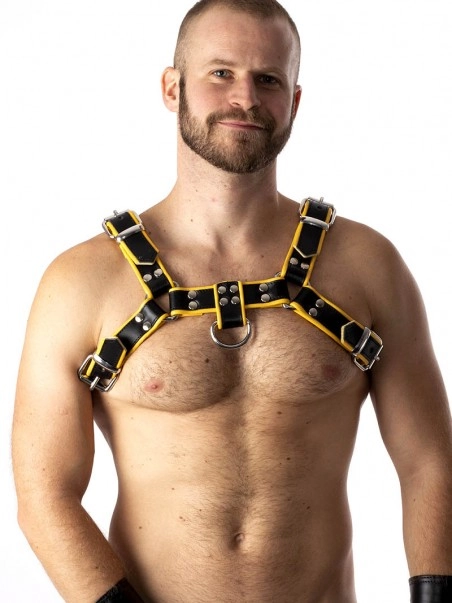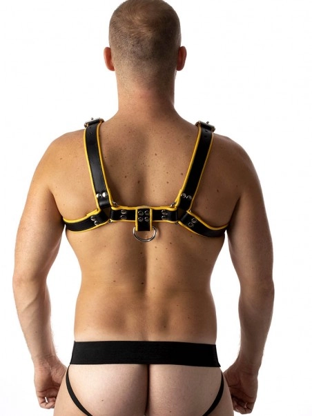 Du00e9clinaison de notre cu00e9lu00e8bre harnais Pitbull en cuir noir souple, ce harnais de poitrine est composu00e9 d’une laniu00e8re en cuir jaune, doublu00e9e d’une laniu00e8reu00a0enu00a0cuir noir lu00e9gu00e8rementu00a0plus u00e9troite. Les deux u00e9lu00e9ments sont cousus et l’ensemble est rivetu00e9.u00a0