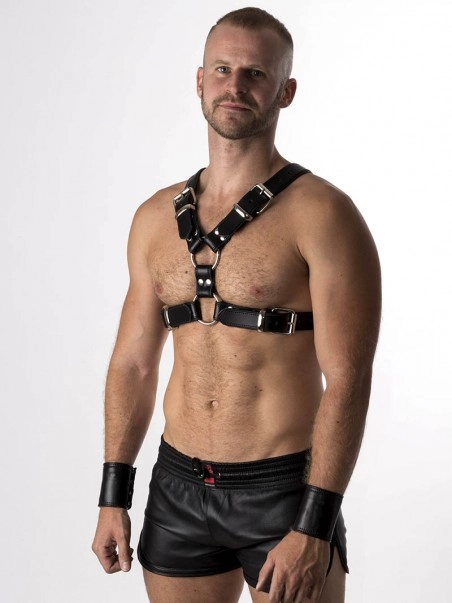 Harnais de poitrine en cuir fin et doux, doublu00e9 d’une sangle (3.5cm) de cuir noire plus u00e9troite. Les deux u00e9lu00e9ments sont cousus et l’ensemble est rivetu00e9. 4 boucles su00e9paru00e9es vous permettent d’ajuster le harnais u00e0 la morphologie de votre corps pour un port confortable et sexy. Les laniu00e8res sont rivetu00e9es.u00a0