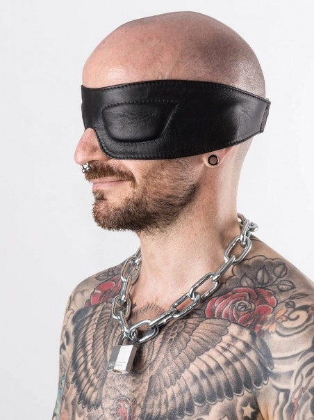 Le masque est en cuir surpiqué. La découpe des yeux est capitonnée complétant l’opacité.