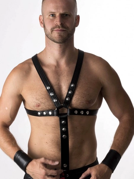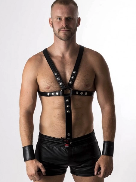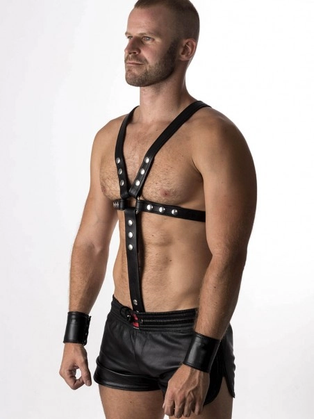 Sangle en cuir d’une largeur de 3.5cm. La longueur est ru00e9glable. Les 2 extru00e9mitu00e9s de la sangle s’attachent au harnais et au cockring u00e0 l’aide d’une boucle munie de boutons u00e0 pressions.