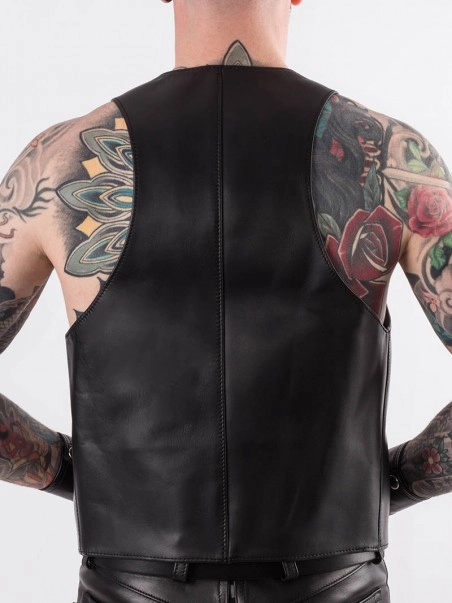 La coupe de notre cu00e9lu00e8bre gilet en cuir est tru00e8s sexy. Elle laisse votre buste et les tu00e9tons exposu00e9s au regard des garu00e7ons vicieux. Le gilet est fait dans un cuir souple et ru00e9sistant. Poche intu00e9rieure zippu00e9e.