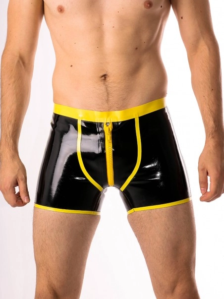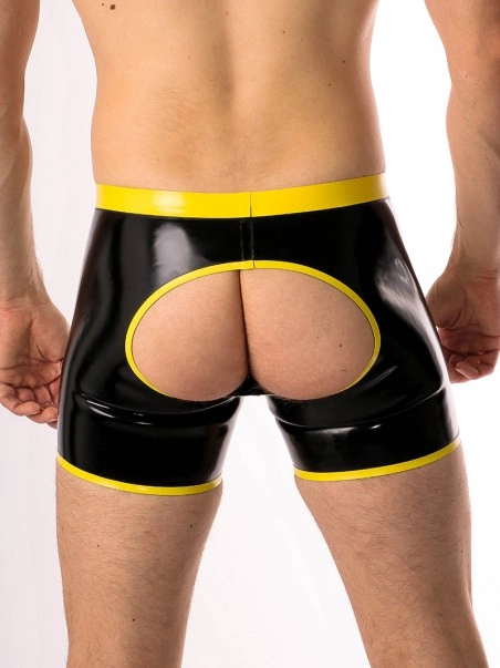 Short sexy, couleur noir et bords jaunes avec le cul ouvert. Latex u00e9p. 0,60mm.